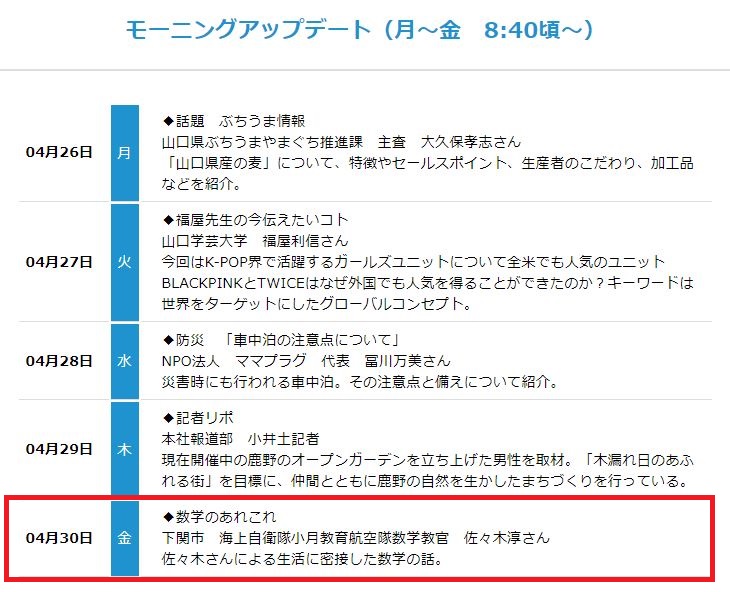 今週のゲストは防衛省海上自衛隊小月教育航空隊数学教官の佐々木淳さんです。[/char]