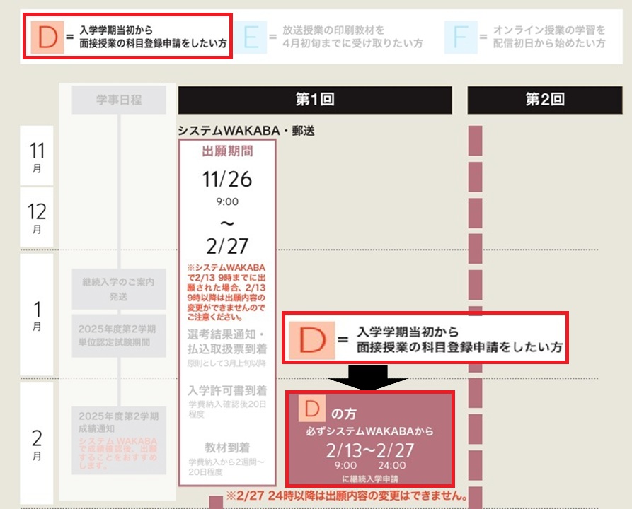 継続入学で、2月中旬より前または3月以降の手続きだと、「当初に」面接授業を選ぶことができません。要は追加するしかなくなります。