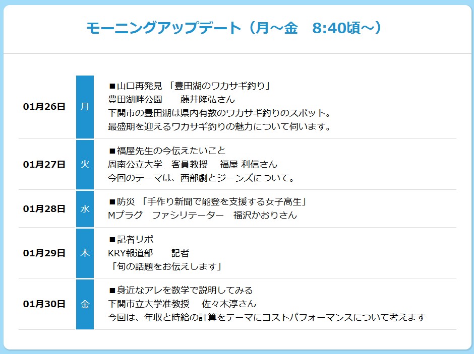 1月30日KRYラジオのKRY MORNING UPに電話出演しました 更新日:2026年2月15日 公開日:2026年1月31日 メディア掲載 8時40分〜50分は、数か月1回の第5金曜日に回ってくるKRYラジオ『KRY MORNING UP』の電話出演しました。 今日は高橋裕アナウンサーがお休みということで、担当は山本博子アナウンサーと小林愛子アナウンサー(今 […] 続きを読む