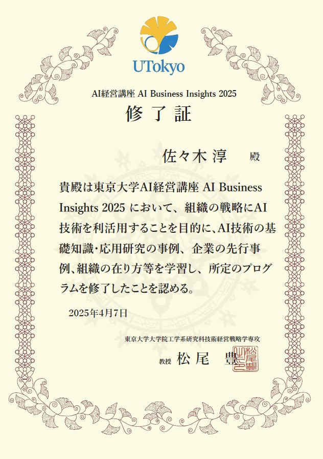 東京大学AI経営講座AI Business Insights2025修了
